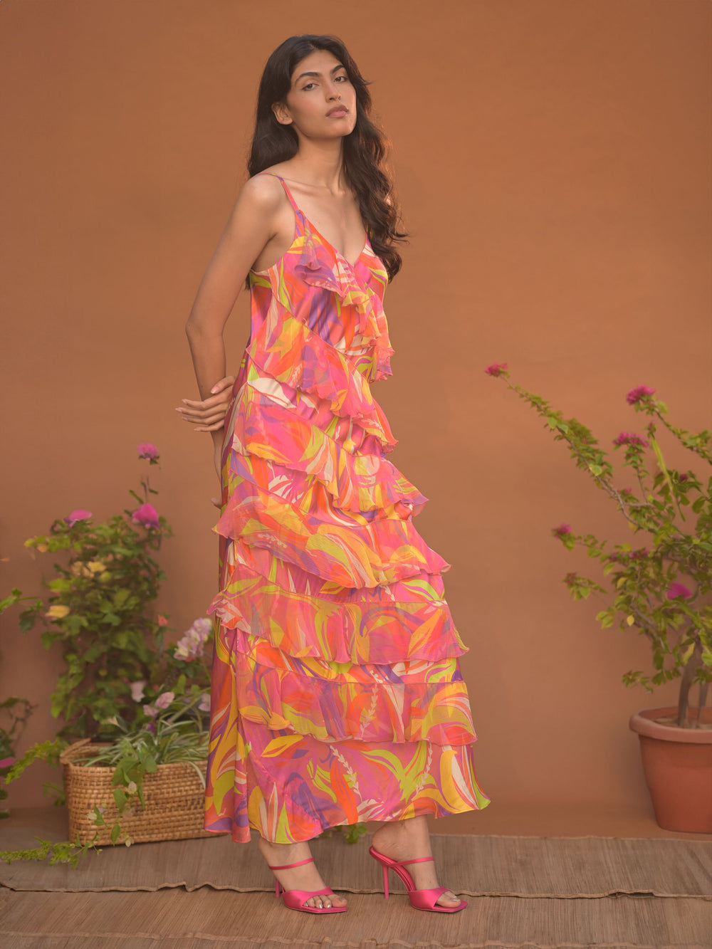 Stunning strappy maxi dress with criss-cross cascading ruffles for extra oomph.