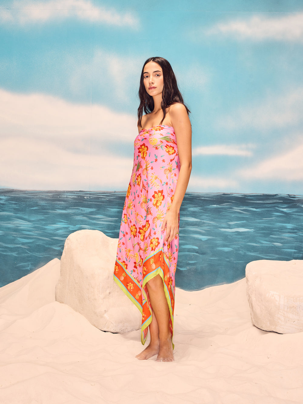 This chic tube dress with intriguing scarf print details will elevate your beachside resort wardrobe. Perfect for