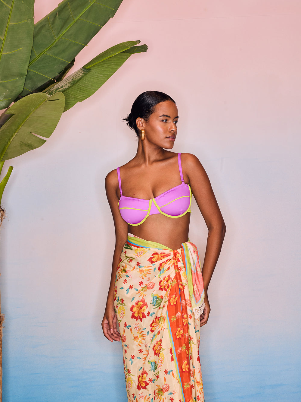 This effortless draped look goes beyond the beach and into the city with its versatile features. Bold print with scarf borders; you can dress it up for a night out or just use it as a coverup for the perfect beach glam avatar. Pairs well with the Prana underwired bikini set