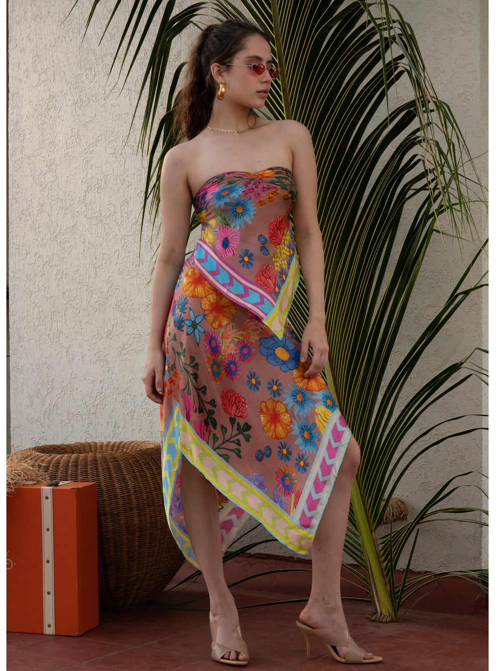 This cute bandeau top in blush hues and scarf print details is a beach resort favorite paired with a versatile handkerchief skirt that can even be worn as a dress.